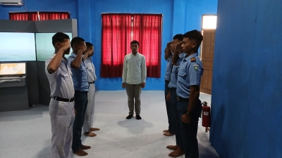 Kesiapan Siswa Sebelum Masuk Ruang Simulator, Siswa bersiap siap untuk masuk ke ruang simulator bersama guru yang mengajar di bidang perkapalan...